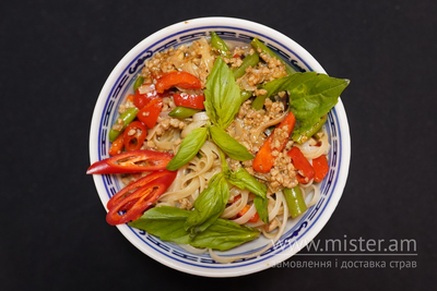 Рисова локшина обсмажена разом із фаршем зі свинини, солодким перцем та гострим чілі, базиліком, цибулькою та часничком.