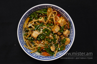 Рисова локшина, соєвий сир тофу, гриби шиітаке, зелена квасоля, морква, солодка цибулька, пекінська капуста, соєвий соус, кунжут.
