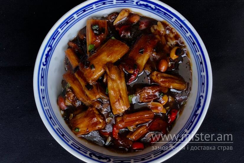 Рисова подушка, фучжу, арахіс, гострий перець чілі, зелена цибуля, часничок, імбир, кунжутна олія.