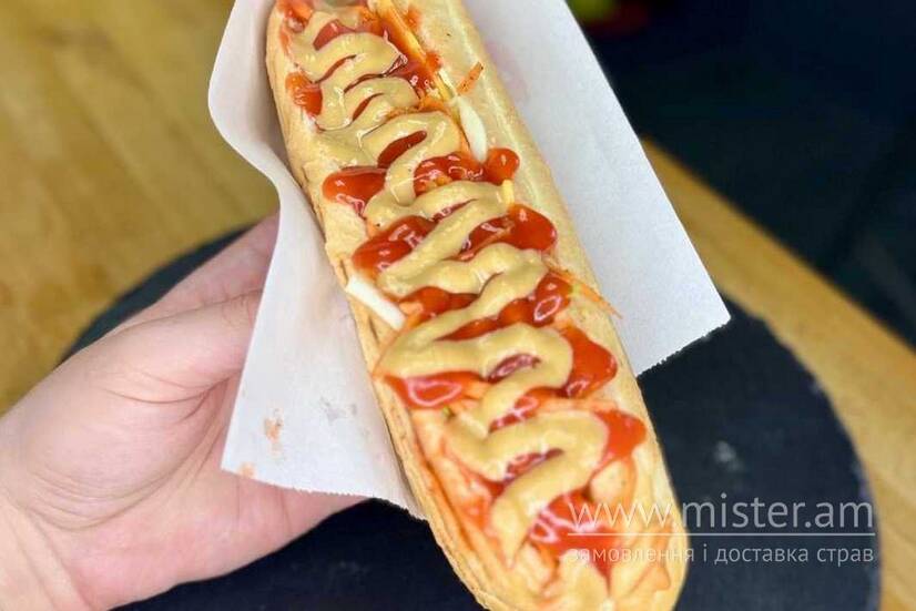 Булка біла, мисливська сосиска, капуста, морква по корейськи, огірок маринований, сир чедер, соус часниковий, соус червоний на основі томатів, гірчиця.
