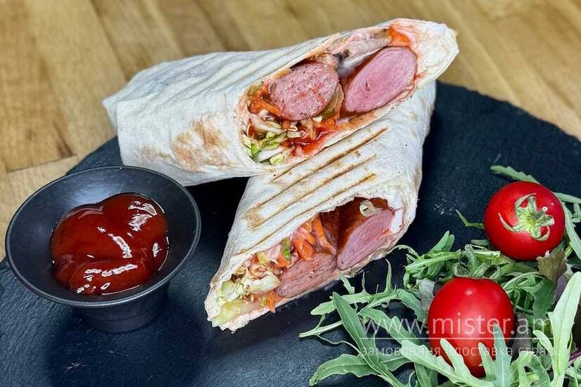 Лаваш, подвійна молочна сосиска, капуста, томати, огірок маринований, морква по-корейськи, соус червоний на основі томатів.