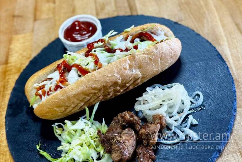 Хот-дог з куркою, картопля фрі, соус в асортименті, напій в асортименті