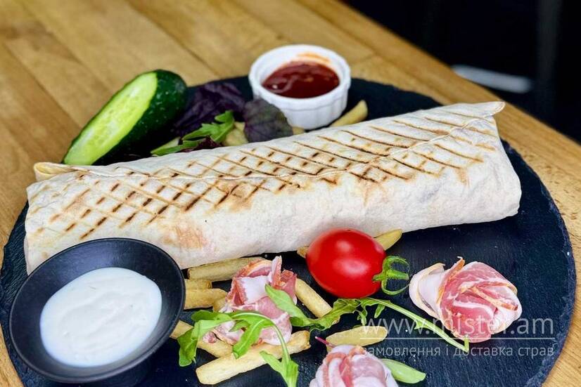 Лаваш, курка, бекон, картопля фрі, капуста, морква по-корейськи, цибуля маринована, огірок маринований, помідор свіжий, сир чедер, соус часниковий, соус червоний на основі томатів.