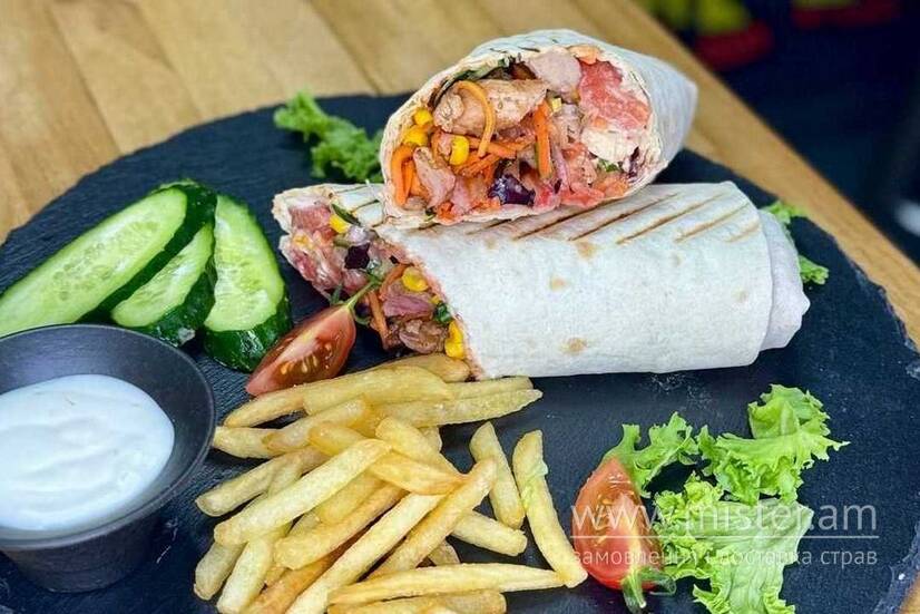 Лаваш, курка, капуста, мікс салату, морква по-корейськи, цибуля маринована, огірок свіжий, томати, кукурудза, плавлений сир, соус часниковий, соус червоний на основі томатів.