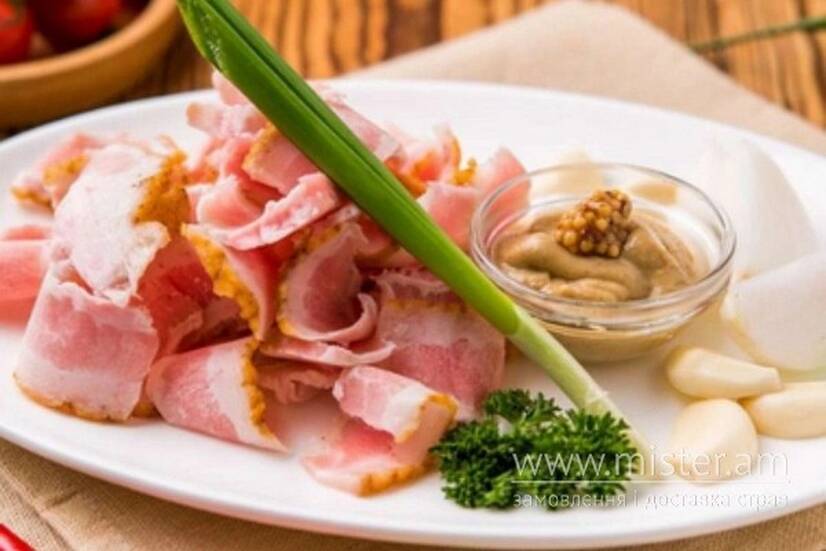 Підчеревина, бородинський хліб, хрін, зелена цибуля.