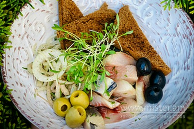 Оселедець, хліб бородинський, цибуля маринована, маслини, оливки.