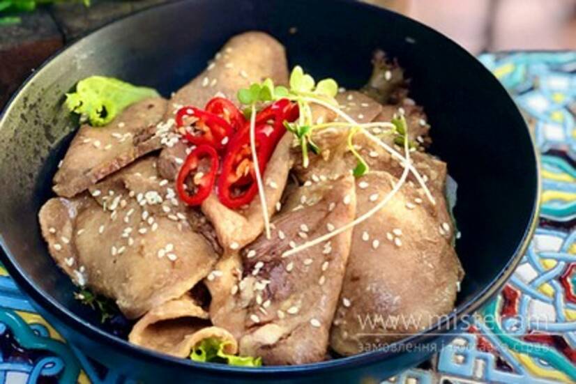 Відварний телячий язик, соєвий соус, часник, зелень, помідори чері.