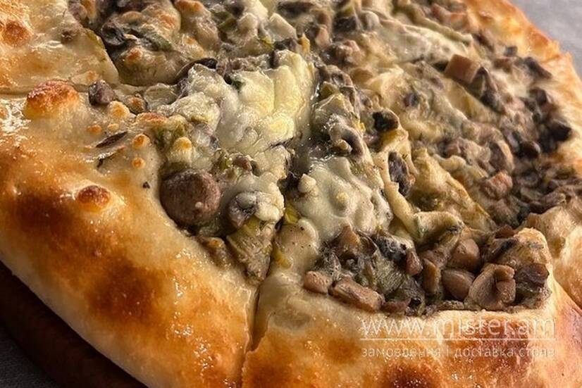 Гриби білі, печериці, цибуля порей, часник, сир сулугуні, сир бринза, олія трюфельна.