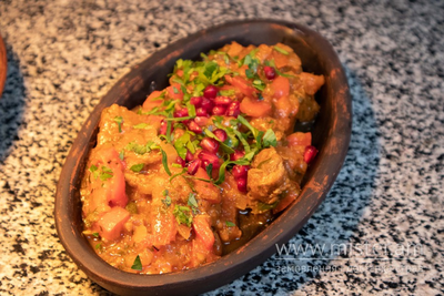 Тушкована телятина з помідорами, болгарським перцем, ріпчастою цибулею, часником, кінзою та спеціями, аджикою і томатною пастою.