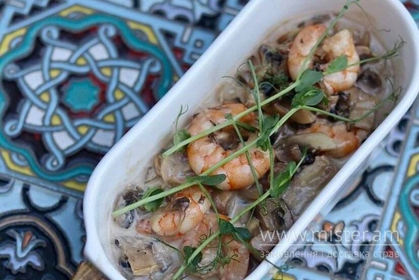 Креветки тигрові, печериці, цибуля ріпчаста, часник, вершки.
