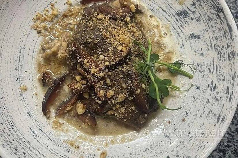 Щоки телячі приготовлені за технологією су-від, печериці, вершки, слива маринована.