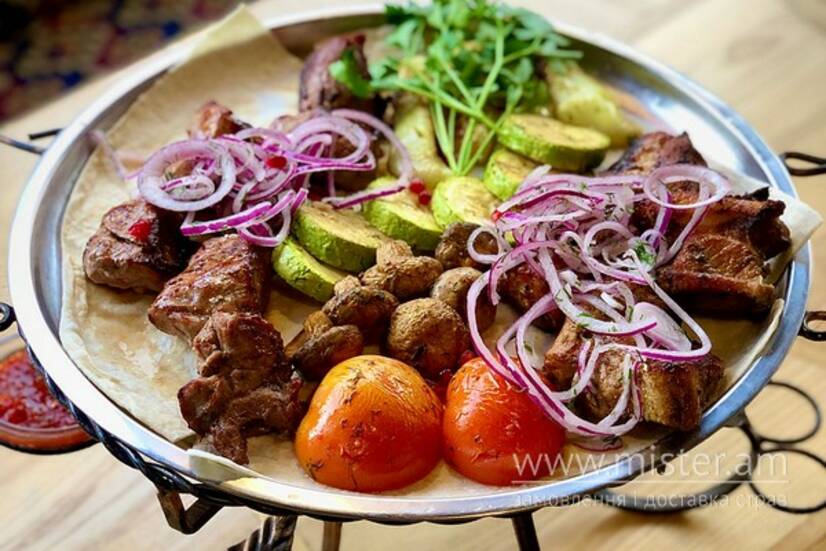Телятина на мангалі, реберця на мангалі, овочі на мангалі, соуси: сацебелі, аджика і ткемалі.