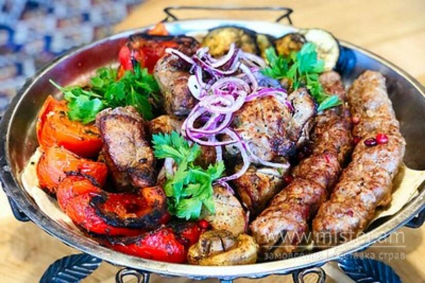 Шашлик зі свинини, телятина на мангалі, люля з телятини, овочі на мангалі, соуси: сацебелі, аджика і ткемалі.