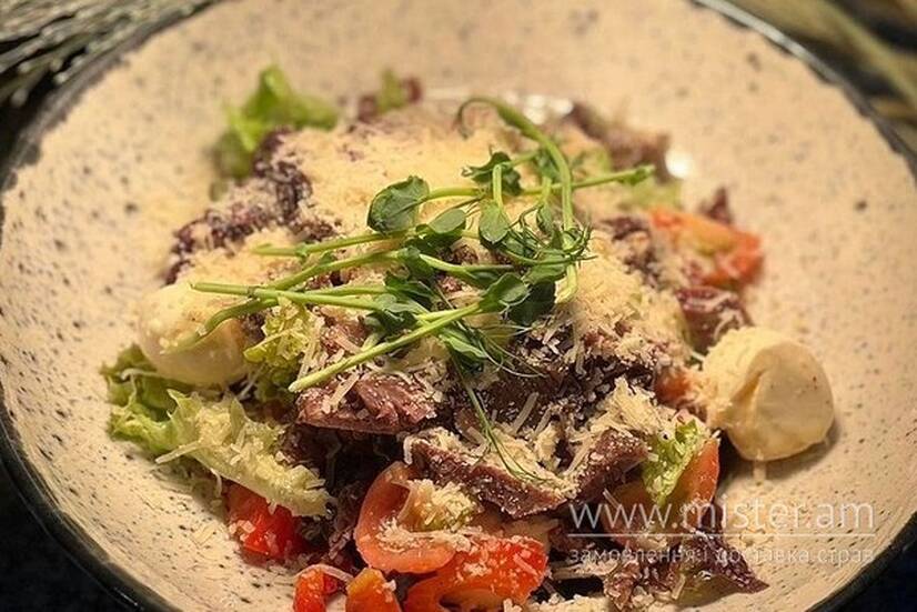 Салатний мікс, помідори чері, перець запечений, моцарела бебі, пармезан, телячі щічки, соус медово-гірчичний