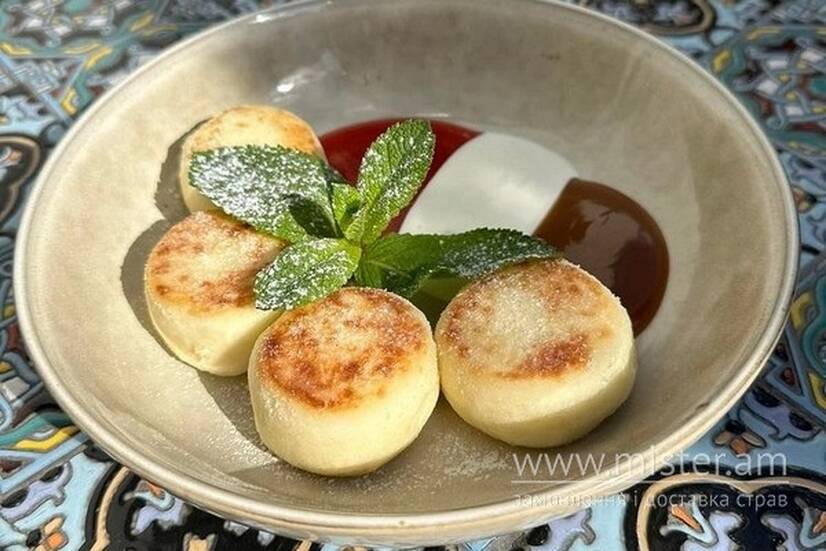 Дуже ніжні сирники, які подаються з топінгом полуниці та карамелі та йогуртом.