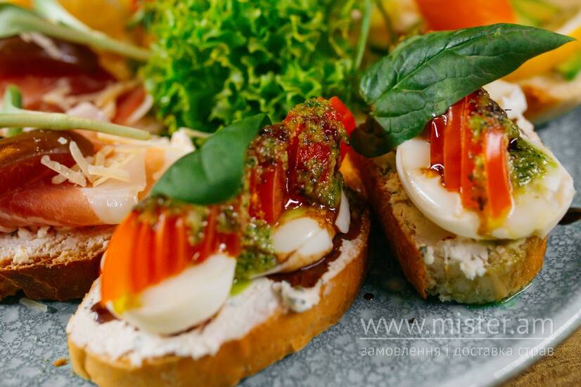 Брускети (з прошутто, сьомгою та "капрезе")