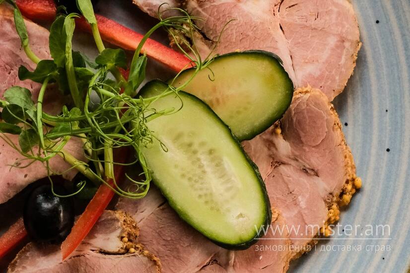Холодні закуски: Масляна копчена / сьомга пряного посолу, Язик в пікантному соусі, Закуска з прошутто, Ковбаса домашня, Скумбрія маринована, Сирна тарілка, Млинці з сьомгою, Млинці з червоною ікрою, Огірки (помідори) “п’ятихвилинка”, Огірки (помідори, капуста) квашені, Сливки мариновані, Брускети (з прошутто, сьомгою та "капрезе"), Асорті домашнього сала, Лаваш з сьомгою, Оселедець, Асорті із італійських ковбасок, Лимон з цукром, Гриби печериці /масляна / опеньки / гливи, Паштет з печінки, Балик, Закуска Капрезе, Тар-тар з оселедця з грінками, Огірки / помідори свіжі, Перець болгарський, Хліб (білий, житній) власної випічки