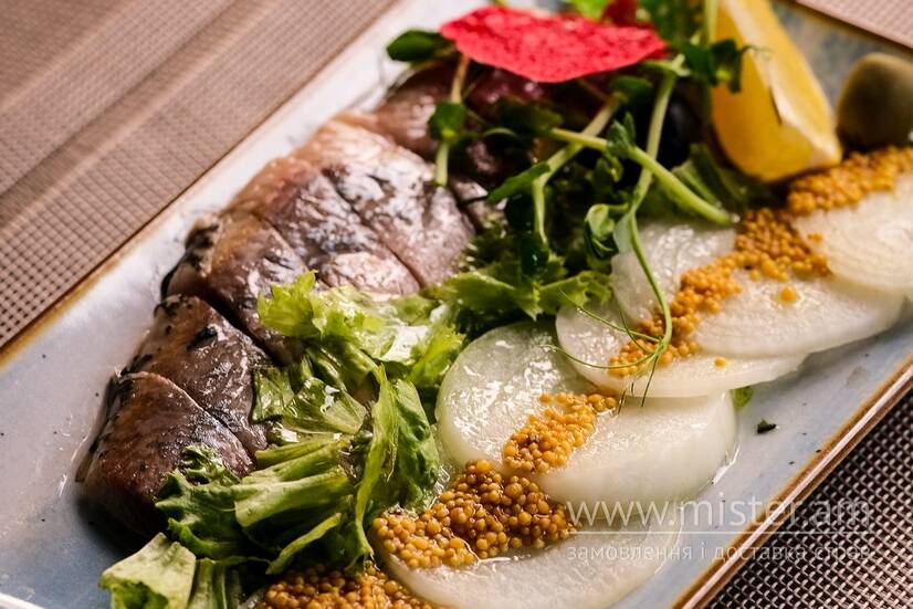 Холодні закуски: Масляна копчена / сьомга пряного посолу, Язик в пікантному соусі, Закуска з прошутто, Ковбаса домашня, Скумбрія маринована, Сирна тарілка, Млинці з сьомгою, Млинці з червоною ікрою, Огірки (помідори) “п’ятихвилинка”, Огірки (помідори, капуста) квашені, Сливки мариновані, Брускети (з прошутто, сьомгою та "капрезе"), Асорті домашнього сала, Буженина, Лаваш з сьомгою, Асорті із італійських ковбасок, Лимон з цукром, Гриби печериці /масляна / опеньки / гливи, Паштет з печінки, Балик, Закуска Капрезе, Тар-тар з оселедця з грінками, Огірки / помідори свіжі, Перець болгарський, Хліб (білий, житній) власної випічки