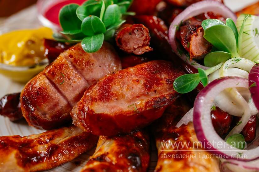 Сосиски мисливські, сосиски мюнхенські, сосиски єгерські, цибуля маринована, гірчиця, соус
