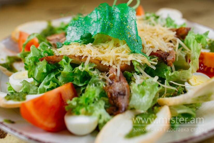 Смажене куряче філе, помідор, лист салату, сир “Пармезан”, сухарики ,соус “Цезар”, яйця перепелині, часник, оливкова олія