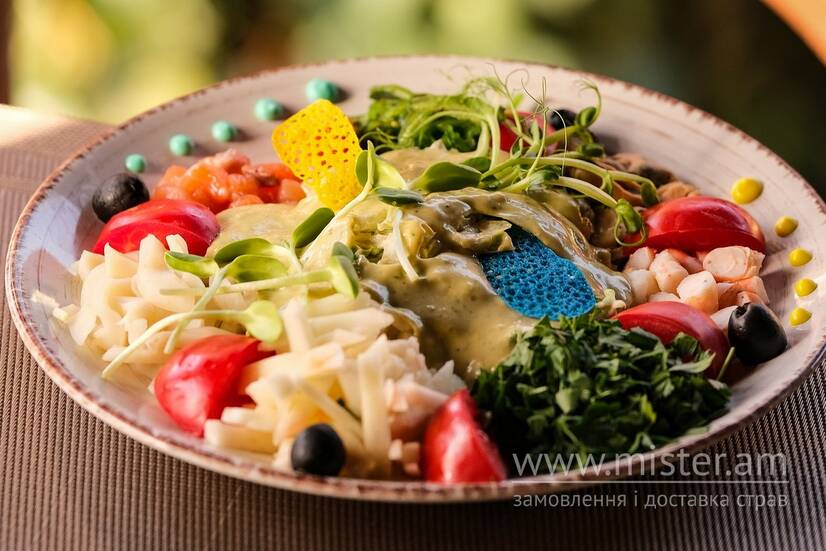 Помідори, мідії, креветки, сьомга солена, кальмари, яблуко, петрушка, водорості чука, лист салату, соус з сиром Пармезан.