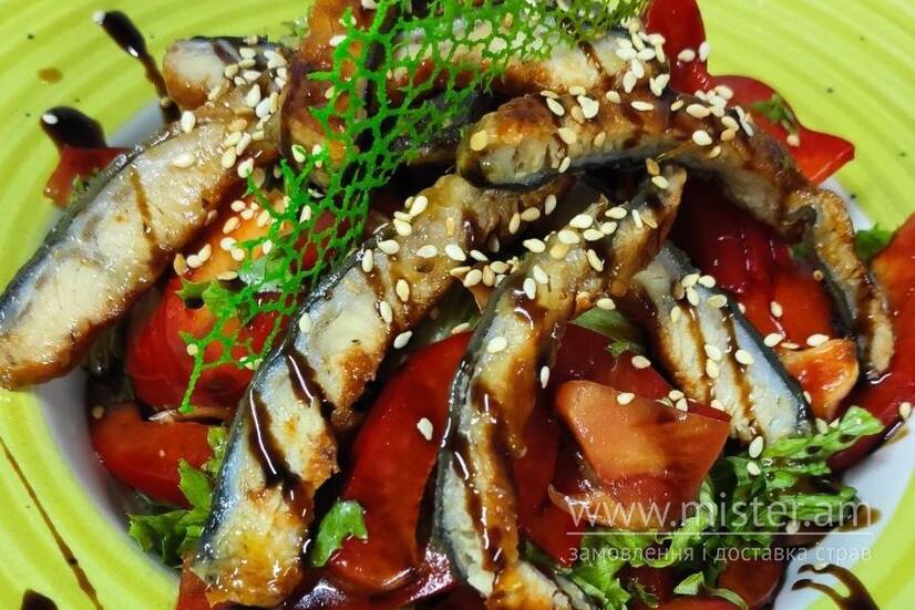 Лист салату, помідор, вугор копчений, кунжут, перець болгарський, оливкова олія, соєвий соус