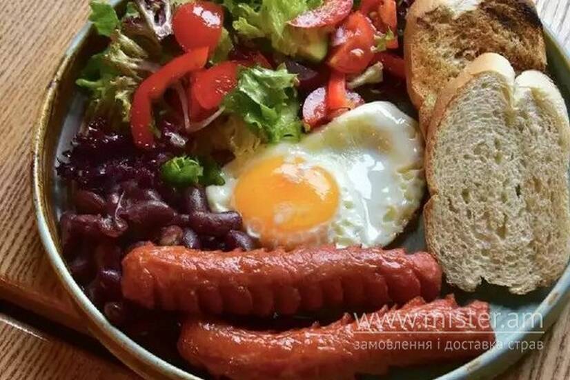 Хрумкі грінки, яйце, смажені сосиски, мікс салату з овочами та квасолею.