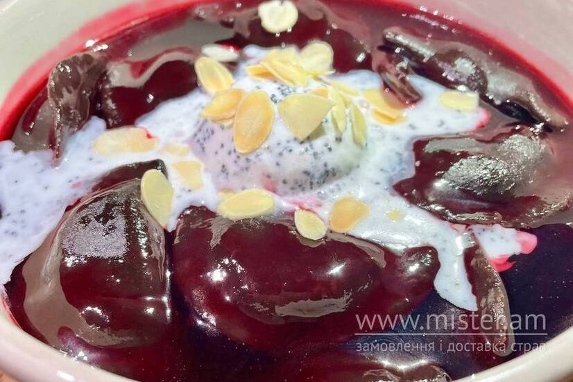 Солодкі вареники з вишнею та шоколадним тістом. Подаються з вишневим киселем, маковим морозивом та мигдальними пластівцями.