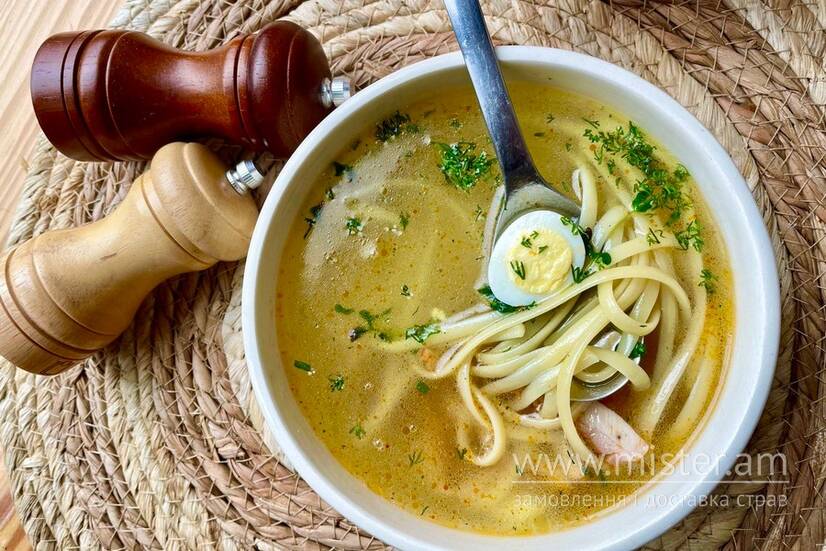 Курячий бульйон з локшиною, курячим стегном та перепелиними яйцями.