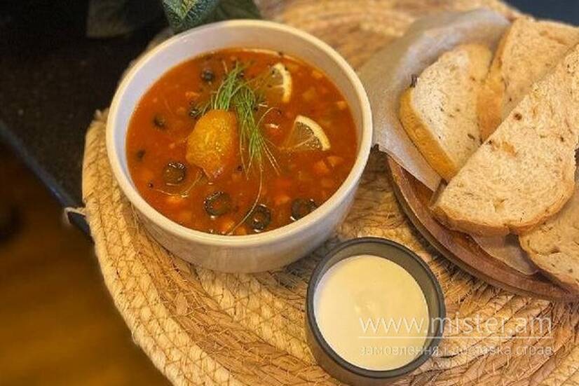 Навариста солянка з мисливськими ковбасками, копченою куркою, беконом, маслинами та маринованим огірком.