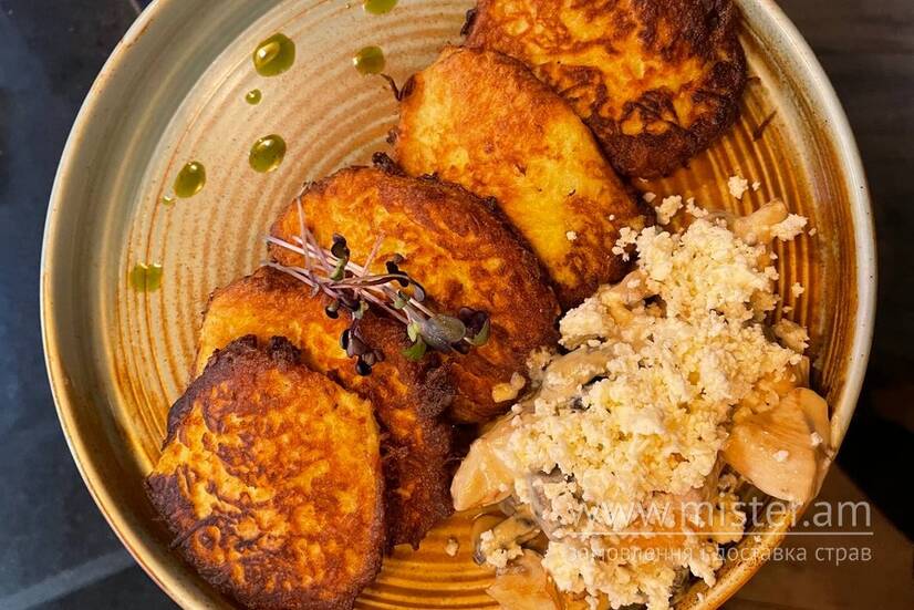 Деруни з куркою та білими грибами у сметанному соусі, подаються з бринзою.