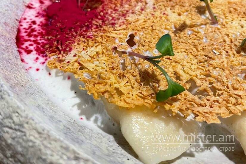 Вареники з солоним сиром, подаються із піною з дор блю та чіпсом із копченого сиру.