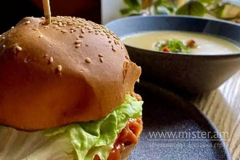 Суп з сочевицею та беконом, бургер з рваною свининою.