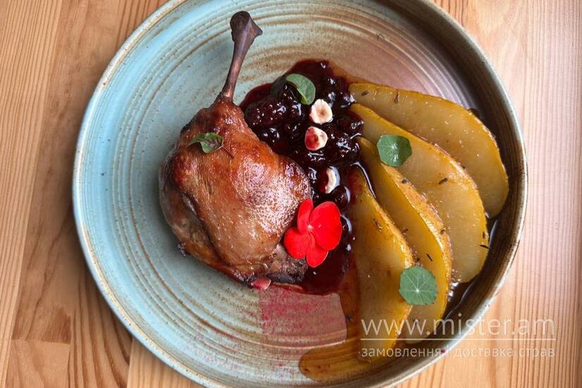 Ніжка, приготовлена за технологією конфі, запечена до скоринки, подається з ароматною лавандовою грушею.