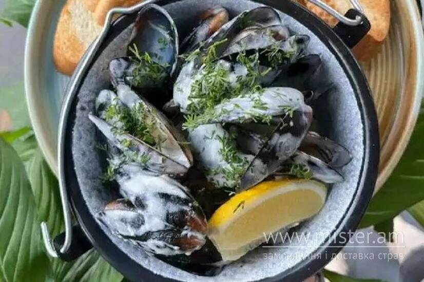 Чілійські мідії у вершково-сирному соусі та вині, подаються з хрумкими грінками.