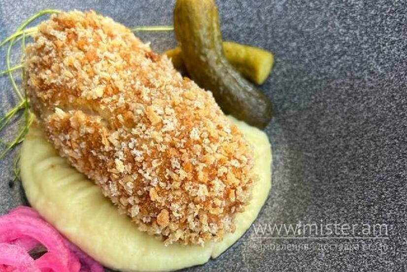 Соковита куряча котлета з сиром емменталь та зеленню. Подається з картопляним пюре, маринованим огірком та цибулею.