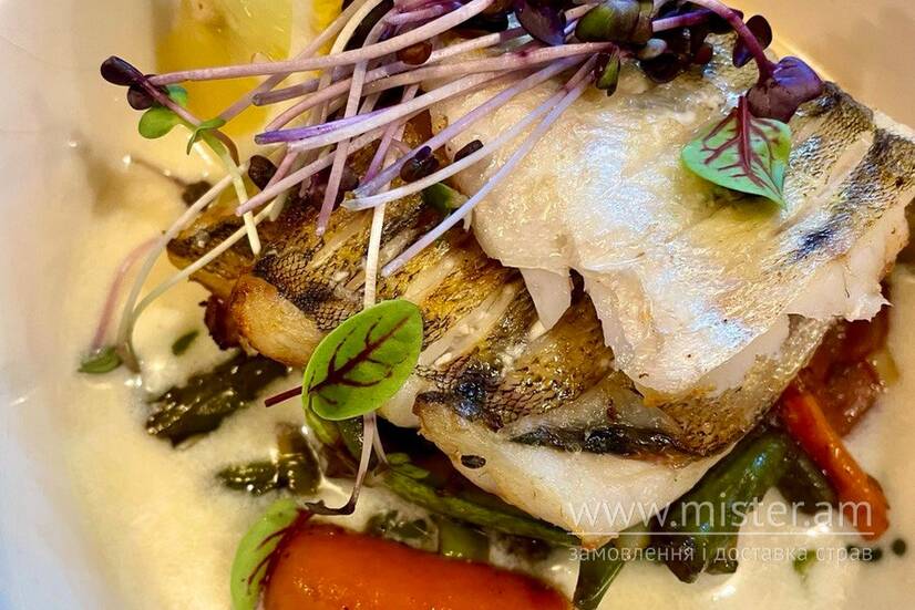 Філе судака на подушці з бебі-моркви, кабачка, стручкової квасолі. Подається з лимоном та соусом бер-блан.