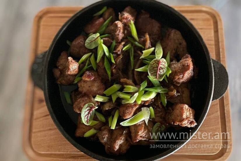 Смажений свинний ошийок, печінка куряча, бебі-морква, цибуля ріпчаста та часник.