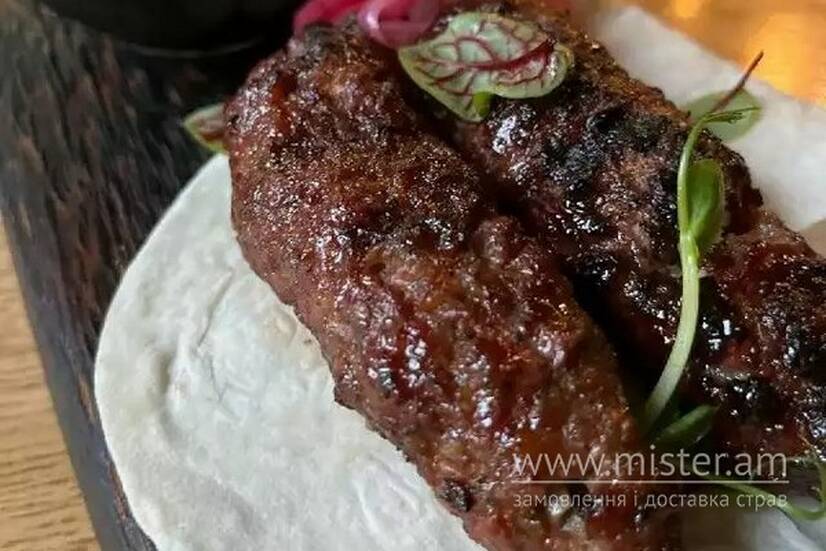 Люля-кебаб з баранини в глазурі з темного квасу. Подається з соусом світ-чилі та маринованою цибулею.