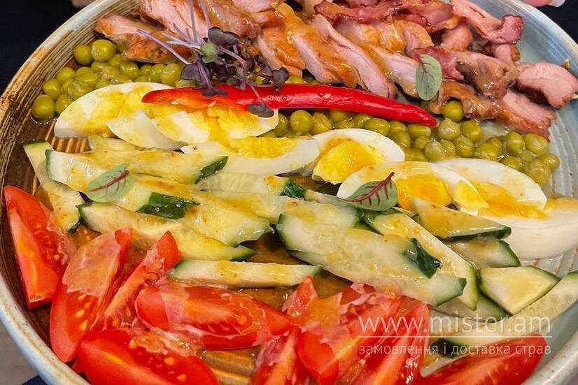 Стегно куряче, бекон, томати чері, огірок свіжий, горошок, яйце куряче та соус гірчичний.