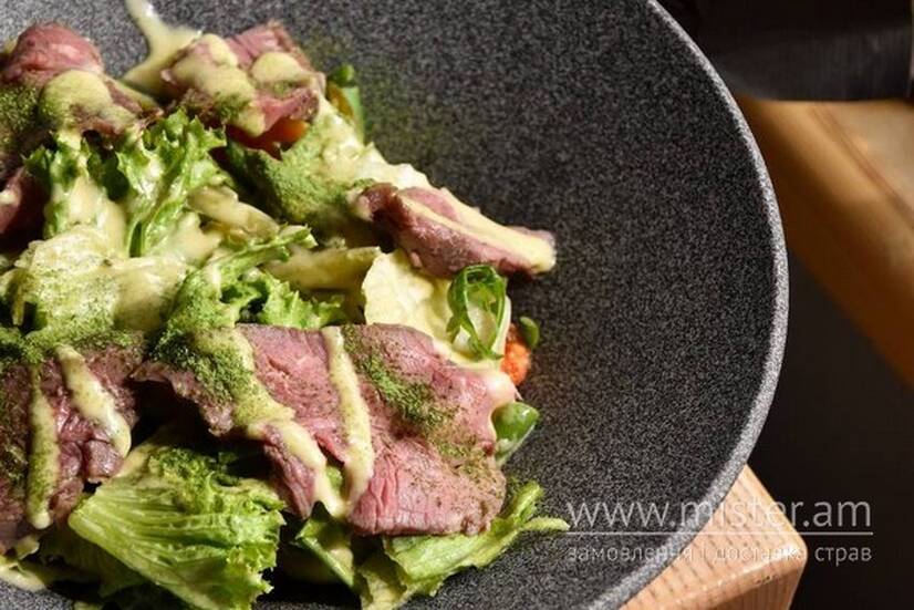 Соковита телятина, мікс салату, печена картопля, запечені помідори, цибуля синя, спаржева квасоля, мариновані огірки, в`ялений перець та соус.
