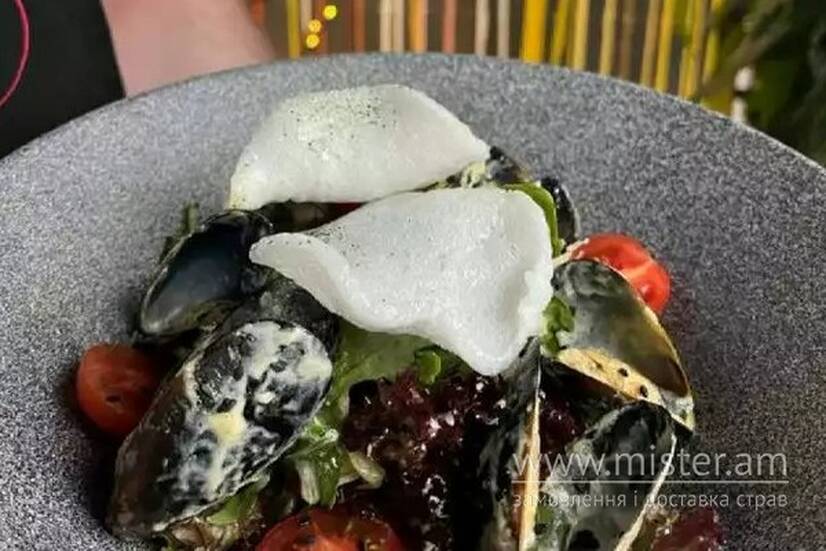 Креветки та мідії смажені з овочами у вершковому соусі, мікс салату, томати чері, кунжут, рисові чіпси.