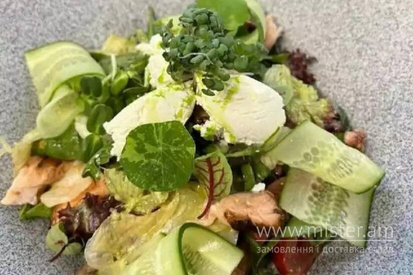Філе лосося, компресовані томати чері, стручкова квасоля, свіжий огірок, мікс салату, крем-сир та медово-гірчичний соус.
