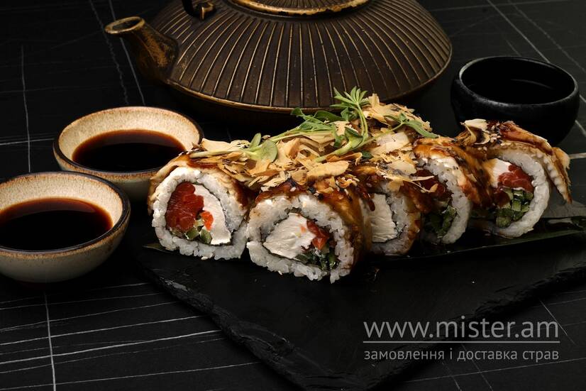 Рис, вугор, лосось, крем-сир Філадельфія, огірок, соус Унагі, стружка тунця, кунжут.