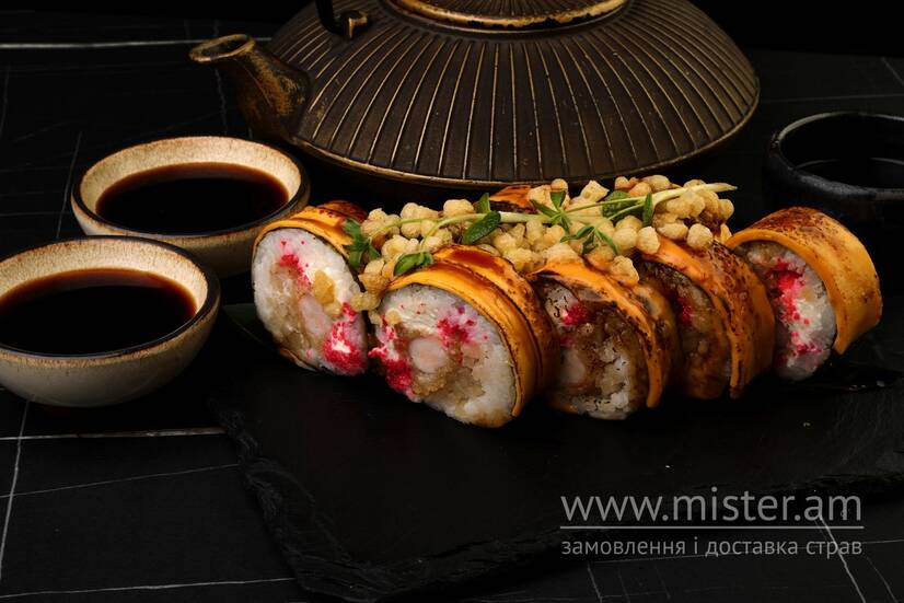 Рис, норі, креветка темпура, крем-сир Філадельфія, сир чеддер, груша, соус Унагі, соус Крем-Чилі.