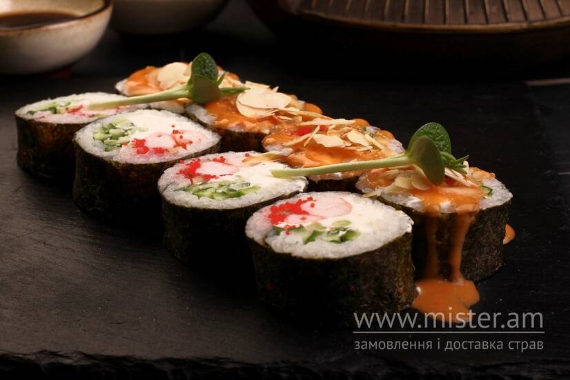 Рис, норі, креветка, крем-сир Філадельфія, ікра, огірок, соус Крем-Чилі, мигдалеві пластівці.