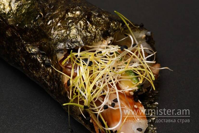 Рис, крем-сир Філадельфія, вугор, авокадо, соус Унагі, , норі, кунжут.