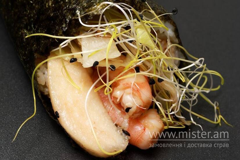 Рис, крем-сир Філадельфія, креветка, груша, айсберг, соус Крем-чилі, норі, кунжут.