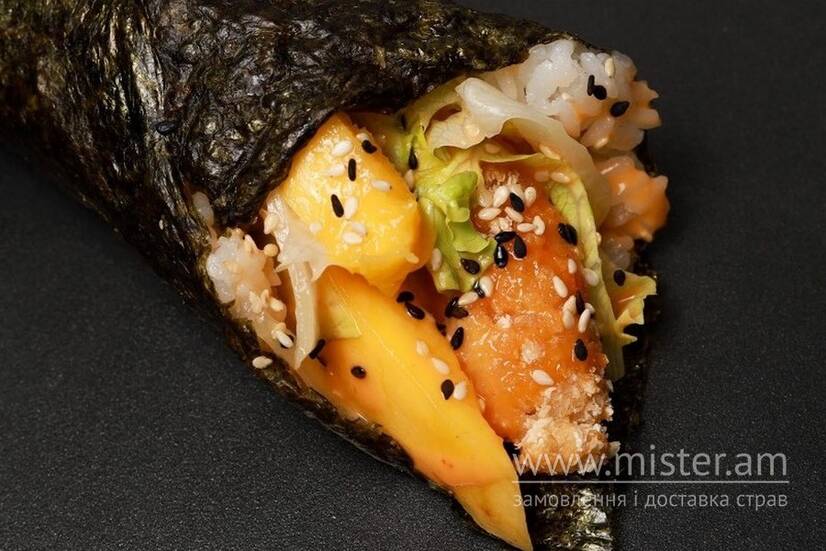 Рис, крем-сир Філадельфія, креветка темпура, манго, соус Крем-чилі, норі, мигдалеві пластівці.