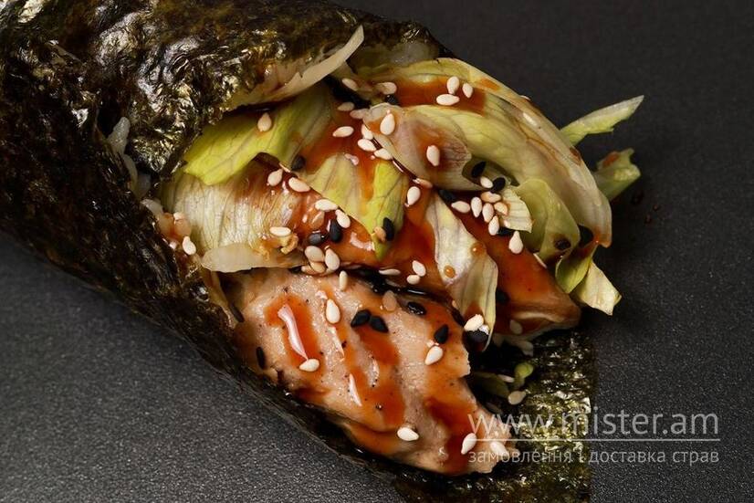 Рис, крем-сир Філадельфія, курка теріякі, огірок, соус Унагі, айсберг, норі, мигдалеві пластівці.